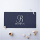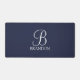 features personalised monogram in white classic script font style and name in white classic serif font style on navy blue background.