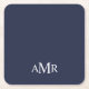 Classic design features personalized 3 letter initial monogram in white classic serif font style on navy blue background.