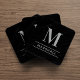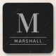 A handsome beverage coaster featuring a pewter gray serif initial and custom family name monogram with horizontal rules on a dramatic black marble stone background. The cool pewter against dark marble creates a sleek, contemporary-classic look. A sharp personalized gift for groomsmen, housewarmings, or any lover of refined home accessories. All text is fully customizable.