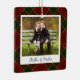 A sweet double sided photo ornament displaying a favourite photo on each side, on a festive red and green plaid background. Personalise with a custom caption on the front in handwritten lettering, and add the year to the back.