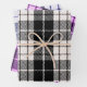 This wrapping paper set features a classic plaid pattern set in black and white, purple and black and navy blue and black.