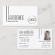 Make a lasting impression with this classic and simple business card design with fine decor black stripes, logo and (employees-) photo on a plain white background.