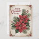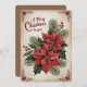 This "A Merry Christmas Holiday Card" is a charming and elegant design that embodies the spirit of the Christmas season. The card features a stunning centerpiece of vibrant red poinsettias, surrounded by lush green holly leaves and pine branches. Rich red berries and delicate white accents on the leaves add depth and sophistication to the design.