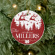 This beautifully classic red and white Christmas ornament features your family name amidst reindeer leaping over Christmas treetops with traditional flourishes and Christmas bells. Personalise by adding your last name when ordering. Makes a great gift or family keepsake.