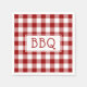 Get ready for your summer barbecue party with paper napkins featuring dark red, white, and light red squares in a classic buffalo plaid with the letters BBQ in a white rectangle in the centre.