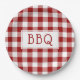 Get ready for your summer barbecue party with paper plates featuring dark red, white, and light red squares in a classic buffalo plaid with the letters BBQ in a white rectangle in the centre.
