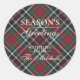 This elegant Christmas label features a plaid pattern and prominently displays the classic message "Season's Greetings." It includes shades of green, dark blue, and red, evoking a classy and nostalgic English holiday atmosphere. You can easily personalize the label with your family's name. This sticker is perfect for decorating your Christmas mail in a traditional colonial style, as well as for a charming country cottage or log cabin theme.