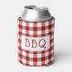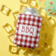 Keep your drinks cool in style at a barbecue with can coolers featuring dark red, white, and light red squares in a classic buffalo check plaid with the letters BBQ in a white rectangle on each side.