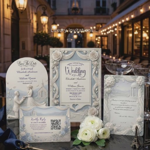Set a romantic tone for your formal celebration with an elegant dusty blue and cream design featuring a faux bas-relief church proposal landscape.