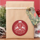 Classic round red and white Christmas sticker. Whimsical design of an ornament with a pair of deer, swirls and snowflakes against a rich red background.