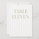 This elegant table number features a soft beige striped background with refined sage green serif typography and subtle script accents. Designed for garden weddings, refined receptions, and timeless outdoor celebrations.