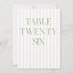 This elegant table number features a soft beige striped background with refined sage green serif typography and subtle script accents. Designed for garden weddings, refined receptions, and timeless outdoor celebrations.
