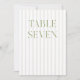 This elegant table number features a soft beige striped background with refined sage green serif typography and subtle script accents. Designed for garden weddings, refined receptions, and timeless outdoor celebrations.