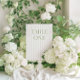 This elegant table number features a soft beige striped background with refined sage green serif typography and subtle script accents. Designed for garden weddings, refined receptions, and timeless outdoor celebrations.