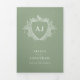 Elegant classic traditional French Victorian sage green toile de jouy chinoiserie style crest monogrammed charming all in one wedding trifold invitation with guest information details and QR code (automatically generated with your web address) to RSVP online.