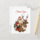 Thank you postcard with a fun Christmas illustration. Santa Claus in his traditional red suit riding a big antlered reindeer decorated with holly. A Christmas tree in the back.