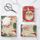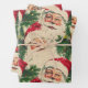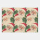 This vintage-style wrapping paper features a repeating pattern of classic Santa Claus faces. Each Santa sports a red hat and a full white beard, with rosy cheeks and a jolly expression. Interspersed among the Santas are sprigs of green pine, adding a touch of festive greenery to the design. The background has a textured, slightly aged appearance, giving it a nostalgic feel.