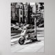 This is a classic vintage poster of a Vintage Italian scooter with a One Way sign in the background, a classic black and white scooter, an Italian retro design.