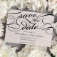 Elegant save the date cards in timeless black and soft, muted cameo blush pink feature embellished script lettering for a classic, formal look.