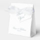 Classic script wedding Thank You favour box. Thank You with bride and groom names and date in light dusty blue script text on a white background.