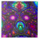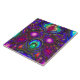 Perfect ceramic tile with an image of a stained glass fantasy created with red, orange, yellow, green, blue, aqua and pink stained glass with a floral design, dotted with luminous purple and deep red crystal orbs.