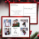 Classically chic tailored and very elegant multi-photo collage design featuring front template for five square photos, custom "Love & Joy" calligraphy graphics and text field with faux hammered metallic style gradient ruby red background. Back features complementary background and editable text fields.