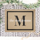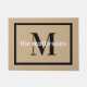 Simple and elegant custom doormat features your family name and monogram in classic lettering on a neutral tan background framed by a thick black border.