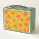 This classic lunch tin has a beautiful floral pattern with bright red-orange flowers and green stems and leaves.