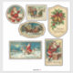 This collection features six vintage-style Christmas stickers that evoke the nostalgic charm of Victorian holiday cards with their muted colours and aged paper textures. The designs include three classic depictions of Santa Claus: one waving from a snowy rooftop, another descending a brick chimney with a sack of toys, and a third riding a white reindeer across a winter landscape. Complementing these are scenes of a family enjoying a horse-drawn sleigh ride, two children pulling a Christmas tree on a sled through a village, and a decorative shield-shaped tag adorned with holly, berries, gold bells, and elegant "Merry Christmas" typography.