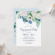 This classic white flowers engagement party invitation is perfect for a spring event. The elegant floral design features soft ivory and white roses, peonies, and chrysanthemum with touches of periwinkle blue watercolor flowers and green foliage.