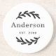 A clean, classic sandstone coaster featuring a black laurel branch wreath framing a custom family name monogram in elegant script with an established date on a crisp white background. The timeless design pairs effortlessly with any decor style. A lovely personalized gift for weddings, housewarmings, or milestone anniversaries. Coordinates with the Laurel Branch Wreath collection. All text is fully customizable.