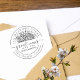 This beautiful round return address stamp features ´´great news´´ text in classy handwriting in the middle, flanked on the top by a bunch of rustic wildflowers. On the bottom, there is a family name in classic serif typography. The address, written in lighter font, gracefully bends around it, in a circular manner. This romantic stamp certainly will add elegance to your special correspondence! To customise this design, simply click on ''Personalise this template'' and change all details. Don't forget to choose the ink colour to personalise it even more!