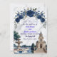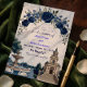 This design features a sophisticated, painted illustration of a classical architecture estate and grand staircase in the distance, viewed through a lush arch of navy and dusty blue roses with soft green foliage. In the foreground, an ornamental stone fountain sits near a tranquil body of water graced by a pair of white swans. The background simulates a refined ivory and light gray faux marble texture to enhance the formal aesthetic. The typography combines handwritten calligraphy script for the names with a traditional serif font for the details. This is a flat printed image with a faux marble and watercolor effect, not actual raised stone or hand-painted material.