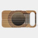 A close up photo of the decorated rosette around the sound hole of a classic guitar, with an inlaid pattern in red, black and green on tan coloured wood, with frets and nylon strings.