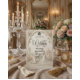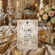 Transport guests to a romantic bygone era with this Regency-inspired engagement design, featuring a faux stone bas-relief effect and soft pastel florals.This design features a sophisticated trompe-l'œil (optical illusion) composition simulating the look of an antique stone carving. The visual center captures a silhouette of a couple in a traditional kneeling proposal pose, framed by an intricate archway of faux sculpted masonry. The "stone" features a warm, neutral cream and beige palette, accented by printed textures of pastel pink roses and sage green climbing vines that appear to grow over the arch. The typography hierarchy balances a bold Gothic blackletter font for the couple's names with a whimsical, flowing calligraphy script for the event details, set against a background of a distant gazebo temple and cobblestone path.