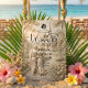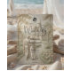 Evoke the timeless grandeur of classical sculpture with this faux bas-relief design, capturing an old-world romantic garden scene in monochromatic cream.This design features a sophisticated trompe l'oeil technique mimicking the look of carved sandstone or plaster. The layout centers on a statuesque couple in flowing robes walking down a stone pathway toward a traditional chapel steeple, framed by a dense floral archway of roses. The monochromatic palette utilizes shades of ivory, beige, and cream to enhance the shadow and light effects of the faux sculpture. Text is presented in a hierarchy of deep charcoal gray, utilizing a striking Gothic Blackletter font for names alongside elegant serif details.This is a flat printed image with a faux stone bas-relief effect, not actual raised material or texture.
