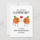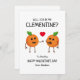 Kids classroom valentines day card featuring a plain white background that can be changed to any color, 2 cute cartoon clementines, a red heart, the funny pun "will you be my clementine?", and the childrens names.