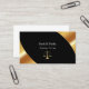 Classy attorney business cards template design with upscale look that includes gold coloured design elements, a gold coloured scale of justice on one side and your contact and company information organised on the second side. Designed for law offices, legal services, or law enforcement.
