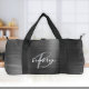 This personalised duffel bag features a monogram and first name in modern grey and white script on an elegant black faux brushed metal background.