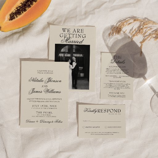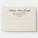 A fancy old money bright chic wedding envelope. Which features bold bride and groom's names in black color. And personalized return address. On fancy creamy color background. Which suits the whole old money luxury wedding suite.