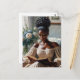 This postcard features an oil painting portrait of an elegant dark-skinned woman with hair in an updo, wearing an off-the-shoulder, off-white dress. She's holding a book, engrossed in whatever she's reading. The melanin-rich beauty from the African diaspora is indoors in a cosy-looking room with a vase of flowers nearby. Soft black girl aesthetic.