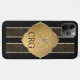 This classy case is perfect for a professional look when you're on the go. This design features a gold and black dotted and striped pattern with a gold and faux diamond crest. Personalise with a three letter monogram just below the golden decoration.