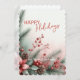 This holiday greeting card is distinguished by its elegant and unique design. It features a classic "Happy Holidays" greeting, which you can customize to your preference, set against a beautiful dark teal green, white, and maroon red wreath bouquet pattern. The front of the card includes space for your family name and a seasonal message, while the back provides an ideal area for adding a custom message or poem. It's a stylish way to send your holiday wishes.