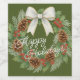 This beautifully designed holiday wine bottle label showcases elegant watercolor artwork of a wreath embellished with a white bow, pinecones, green holly leaves, red berries, and pine needles. Its classy yet rustic design captures the essence of the December holiday season and appeals to those who appreciate artistic illustrations. The label offers customisation options, allowing you to personalise it with your seasonal greeting, making it a thoughtful choice for spreading holiday cheer.