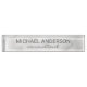 featuring name in grey modern sans serif font style and profession title in grey modern script on white marble background.