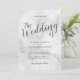 featuring title in grey modern script font with wedding details in grey modern sans serif font on white marble background.