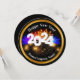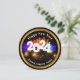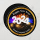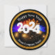 Classy unique business Happy New Year 2024 seasonal greeting card in a cool round shape with festive fireworks graphic in the background and gold tone design element. Editable text you can personalise online with your business name and message.