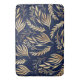 Elegant and simple gold leaves, houseplant foliage hand-drawn navy-blue illustration, filled with a beautiful fall greenery pattern, faux gold foil leaves vegetation, on a dark blue colour, navy-blue background. Botanical floral nature hand painting, contemporary plant design.