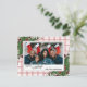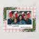 Unique, classic, trendy, pretty and decorative Holiday card. Cute Happy Holidays greeting text and room to customise or personalise with a photo, family name (or individual names) and message of your choice. Framed by Burgundy wine red berries and dark green foliage wreath bouquets on a classy coral red and white French country cottage gingham check background.