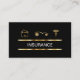 Classy insurance business card template including the appearance of a gold house symbol, car symbol, and health symbol representing insurnce for home, auto, and health. Designed for an insurance company, sales rep, or claims adjuster.